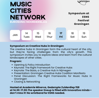 Hosted at Academie Minerva on January 17, this free event brings together creatives, cultural entrepreneurs, and policymakers to shape the future of Groningen's cultural ecosystem. The line-up of speakers for this event oozes with creative minds, so you better do not miss out on this one. This symposium is organized in collaboration with ESNS, Municipality of Groningen, Municipality of Nijmegen, and us, the Music Cities Network. No wristband for ESNS needed.